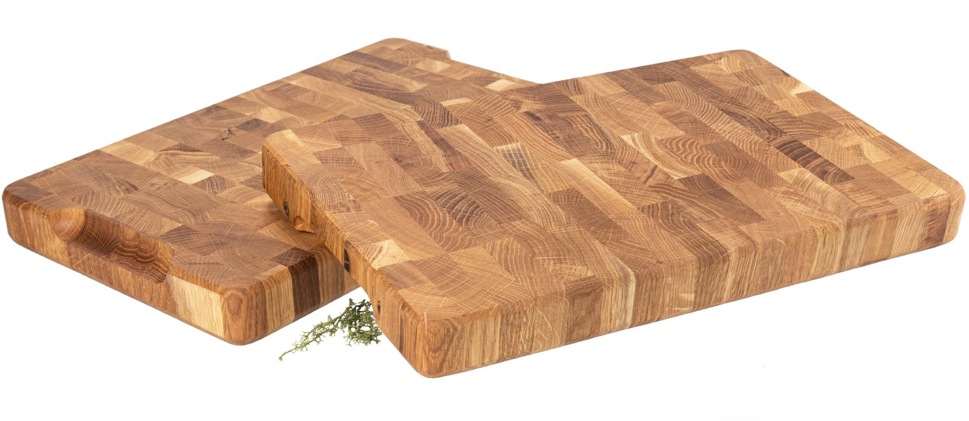 Stirnholz Schneidebrett aus Eiche – optisch ein Hingucker und zudem extrem robust. Eichenholz ist besonders langlebig, antibakteriell und Klingen freundlich.